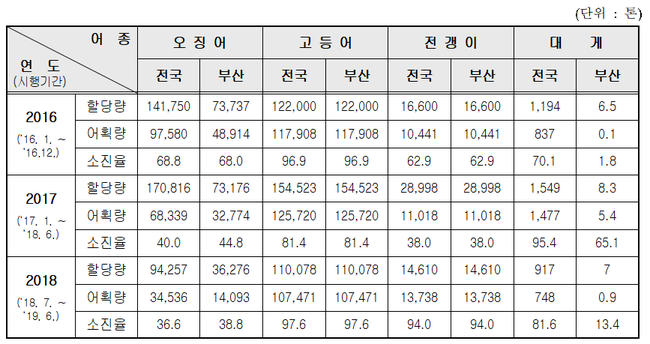 이번 어기에 부산에 배정된 총허용어획량는 전국 총허용어획량 30만8천735톤의 약 63%에 해당하는 물량으로 지난해에 비해 약 15% 증가했으며, 어종별로는 고등어, 전갱이, 대게의 총허용어획량이 늘었고, 오징어 총허용어획량은 감소했다.