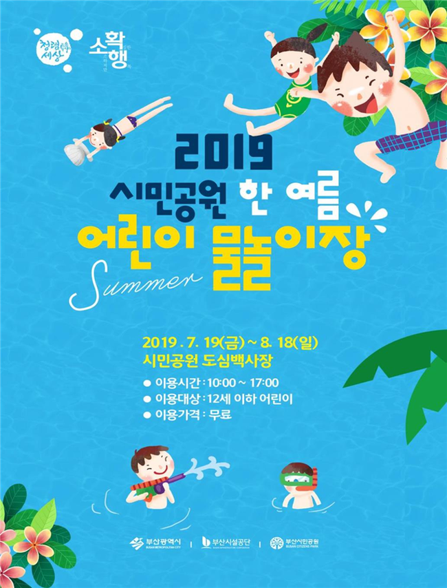 또한, 부산시민공원 도심백사장에서는 19일부터 8월 18일까지 대형수영장, 유아수영장 각각 1개와 대규모 워터슬라이드를 설치, 시민공원을 어린이 물놀이장으로 바꿔 어린이 손님을 모신다. 신나는 물놀이는 무료로 즐길 수 있으며 초등학교 6학년 이하의 어린이만 이용할 수 있다. 수영장을 이용할 수 없는 어린이는 인근에 조성 된 로켓 놀이대, 물고기 물놀이, 포토존에서 재미난 여름을 보낼 수도 있다.