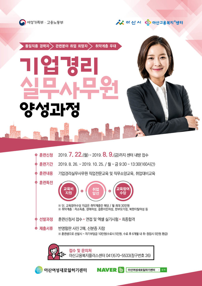 아산여성새로일하기센터는 오는 8월 26일부터 10월 25일까지 진행되는 국비지원 직업교육훈련 ‘기업경리실무사무원양성과정’ 직업교육훈련생을 모집한다.
