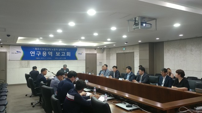 파주시는 지난 17일 시청 비즈니스룸에서 파주시의원, 노동조합 및 단체 대표, 관련부서 국·과장 등 20여명이 참석한 가운데 ‘파주시 민간부문 비정규직 노동자 실태조사 연구용역’ 보고회를 개최했다.