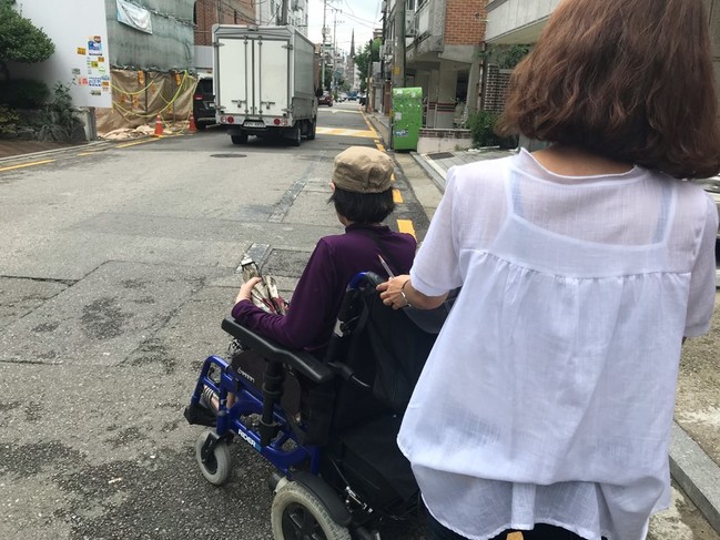 마포구 연남동의 복지플래너가 거동이 불편한 주민의 외출을 동행하며 도와주고 있다.