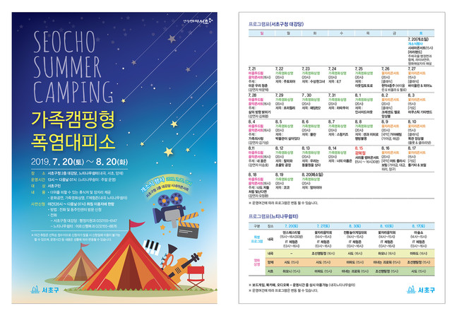 운영 기간 동안 구청과 내곡느티나무쉼터에서 주민들의 사생활을 보호할 수 있는 실내용 텐트를 비롯, 지역내 예술가들의 꽃자리콘서트, ‘주토피아’, ‘수상한 그녀’ 등 가족영화 상영, 북카페, IT체험존, 보드게임 등 다양한 볼거리, 즐길거리를 함께 제공해 가족과 여름캠핑을 온 듯한 추억을 선사할 계획이다.