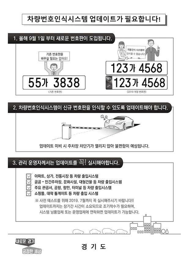 시 담당자는 “자동차등록번호 체계 변경에 따른 주민 불편을 최소화하고자 차량번호인식시스템 업데이트를 지속해서 홍보할 것”이라며 “차량번호 인식시스템 관리 주체는 기한 내에 꼭 업데이트를 완료해 달라”고 당부했다.