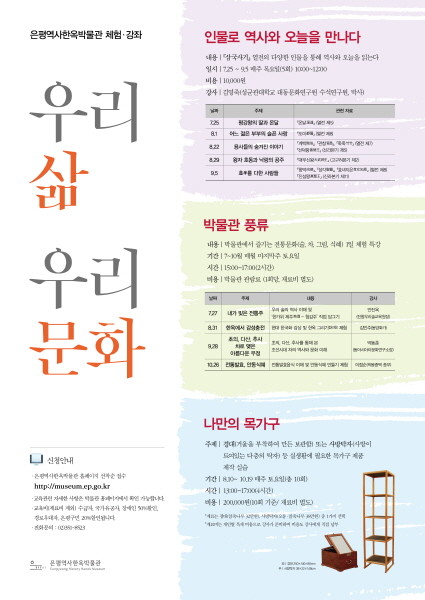 은평구에서 운영하는 은평역사한옥박물관에서는 성인들이 무더운 더위를 피해 시원한 박물관에서 즐길 수 있는 체험·강좌를 운영한다. “우리 삶, 우리 문화” 라는 주제로 역사적 인물로 보는 인간 이해 술, 차, 발효음식 등 전통음식 만들기, 전통 목가구 만들기 등 전통문화를 체험할 수 있는 기회를 마련했다.