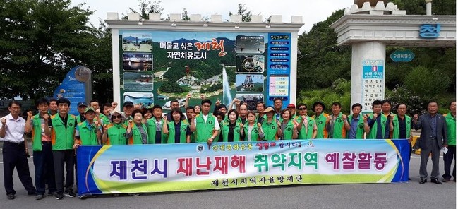 제천지역자율방재단는 지난 17일 여름철 재난재해 취약지역 예찰 및 응급복구활동의 일환으로 청풍 만남의 광장 주변 등에서 합동 예찰활동을 실시했다.