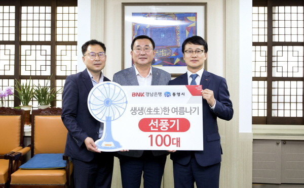 다양한 지역 봉사활동과 나눔활동을 통해 지역사랑을 실천해 오고 있는 BNK경남은행이 지난 17일 통영시를 방문해 관내 어려운 계층이 시원한 여름을 날 수 있도록 선풍기 100대를 기탁했다.