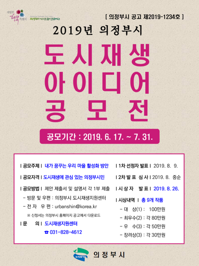 [30-20190718124258.png][제호]의정부시 도시재생과는 오는 31일까지 ‘2019년 의정부시 도시재생 주민 아이디어 공모전’을 접수한다.