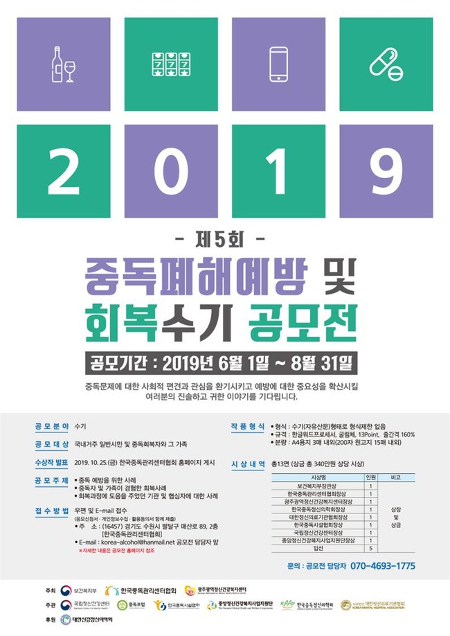 공모 주제는 중독 예방을 위한 사례, 중독자 및 가족이 경험한 회복 사례, 회복 과정에 도움을 준 기관 및 협심자에 대한 사례 등이다.