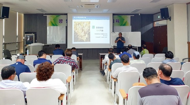 하반기 콩 다수확 안정생산 재배기술 보급을 위해 마련된 교육에서는 죽산콩영농조합법인 한은성 대표가 강사로 나서 우수사례를 중심으로 안내했다.