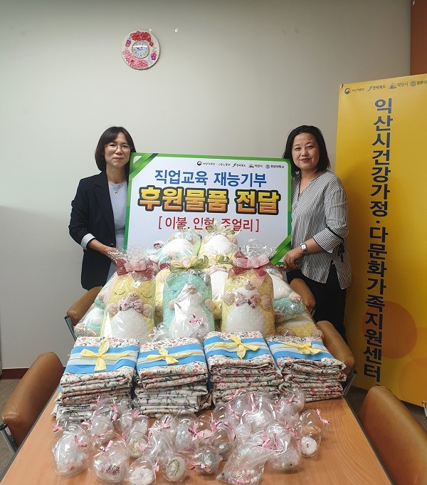 익산여성새로일하기센터 직업교육훈련생들은 18일 교육기간동안 갈고 닦은 실력으로 만든 작품을 익산시 건강⦁다문화가족지원센터에 기부했다.
