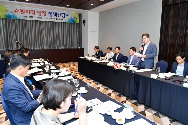 염태영 수원시장과 수원 지역 국회의원들이 18일 팔달구 라마다프라자 수원호텔에서 당정 정책간담회를 열고, 수원 지역 주요 현안 해결을 위해 적극적으로 협력하기로 했다.