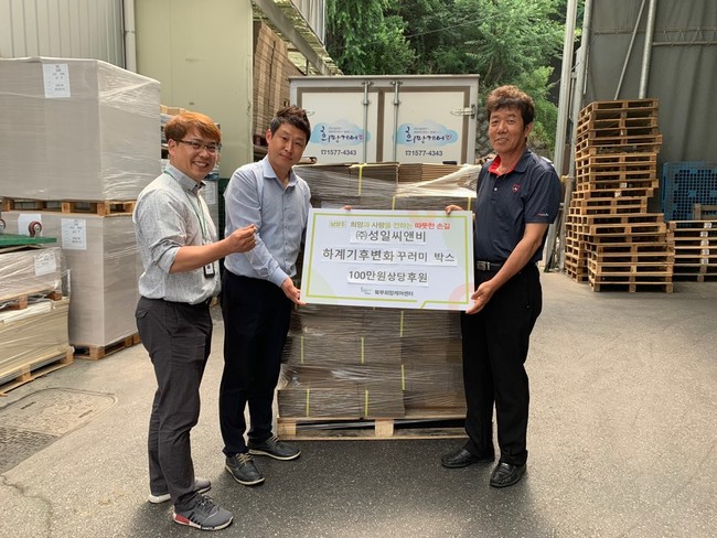 ㈜성일씨앤비 김남일 대표는“어려운 환경 속에서 더위를 버티고 계실 분들에게 작은 정성이지만 도움을 드릴 수 있어 기쁘고 시원한 나눔 꾸러미가 폭염 취약 계층 분들에게 뜻깊게 전달되었으면 좋겠다.”고 전했다.