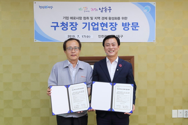 이강호 남동구청장이 지난 17일 남동국가산업단지에 위치한 ㈜크레비스와 한국파메드㈜ 2곳의 기업 현장을 방문해 현장 근로자를 격려하고 기업과 소통하는 자리를 마련했다.