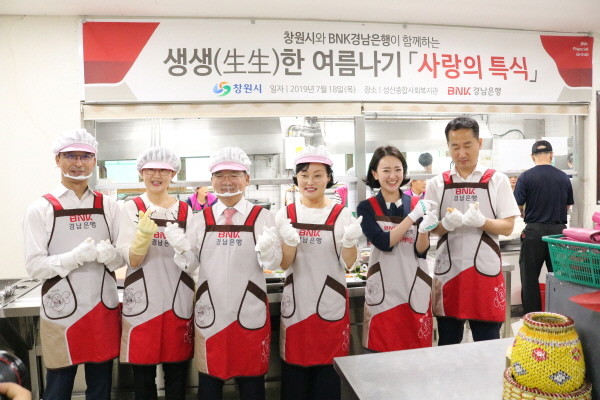 BNK경남은행 안태홍 경영기획본부장 등 임직원 10여명은 무료급식소 이용자 150여명에게 여름철 건강식인 삼계탕과 떡, 제철과일을 대접했다.