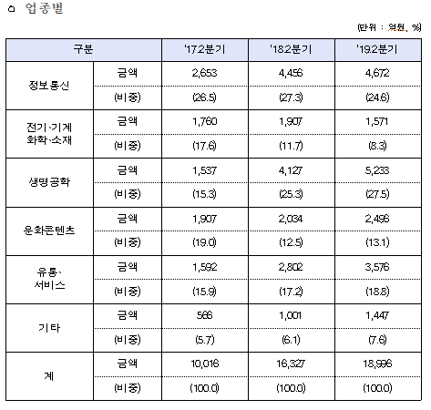 또한, 지난해 전체 투자액 34,249억원의 절반을 이미 넘었으며, 현재 상승세를 감안할 때 ‘19년 전체 투자액은 4조원을 달성할 것으로 기대된다.
