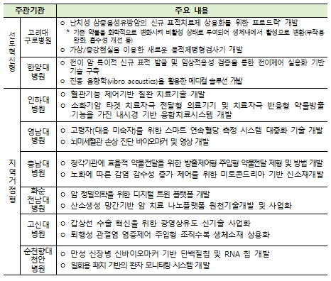 선도혁신형에서는 전국 12개 병원이 지원해 고려대와 한양대 병원이 최종 선정되었으며, 지역거점형에서는 5개 권역별 경쟁에서 인하대·영남대·충남대·순천향대·화순전남대·고신대 등 6개 대학병원이 선정됐다.