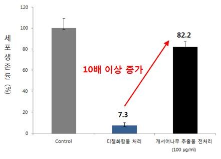 연구결과 각질형성세포에 경유화합물을 처리하면 세포생존율은 8% 미만으로 감소하나 개서어나무 추출물을 미리 처리한 실험군에서는 그의 10배가 넘는 80% 이상의 생존율을 보였다.