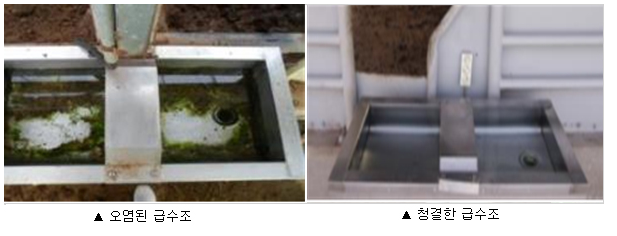 수조를 매일 청소하는 농가 급수조와 비정기적으로 청소하는 농가의 급수조 오염도를 측정한 결과, 비정기적으로 청소하는 급수조에서 15배 이상의 오염도를 확인했다.