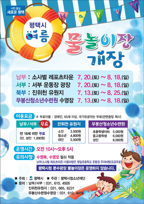 또한 북부지역 시민들을 위해 무봉산청소년수련원 숲속수영장을 7월 13일에서 8월 13일까지, 진위천시민유원지 물놀이장을 7월 13일에서 8월 25일까지 운영할 예정이다.
