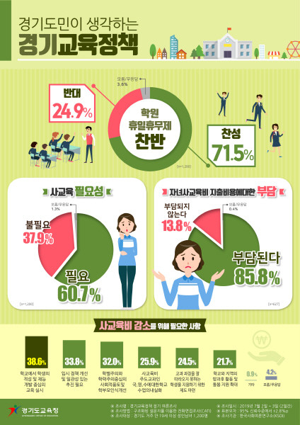 한편, 초·중등학생을 대상으로 공휴일과 휴일에, 고등학생을 대상으로는 공휴일에 학원이 수업이나 특강 등 일체의 교육 행위를 제공하지 못하도록 법으로 규제하는‘학원 휴일휴무제’도입에 대해서는 경기도민의 71.5%가‘찬성한다’고 응답했다.