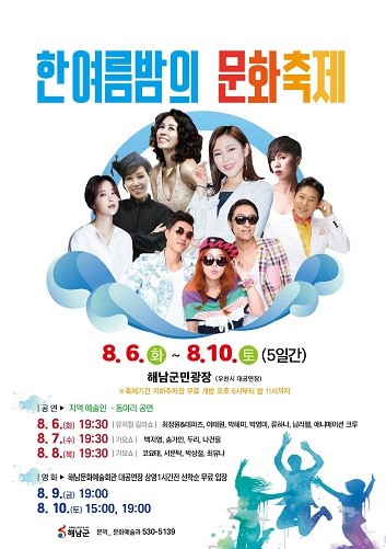 해남군은 오는 8월 6일부터 8월 10일까지 5일간 군민광장에서 ‘2019 땅끝 한여름밤의 문화축제’를 개최한다.