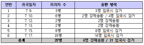 송환 대상자가 총 37명에 달해, 현지 이민청과의 추방협의에 상당한 시일이 소요되었고 특히 인천 직항 국적기가 1일 1편에 불과해 매일 2명씩 송환해도 최소 19일이 소요되는 등 피의자들의 현지 수용소 구금을 장기화하는 문제 역시 고려해야만 했다.