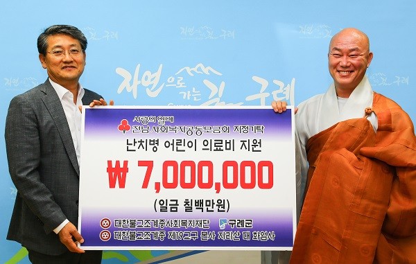 김순호 군수는 “지역의 어려운 이웃을 위해 나눔 실천을 위해 매번 발벗고 동참해 주신 화엄사 주지스님께 감사드리며, 공적지원을 받을 수 없는 어려운 가정에 병원비를 지원해 드림으로써 밝고 건강한 가정을 이루고 아동은 하루빨리 완쾌되길 바란다“라고 말했다.