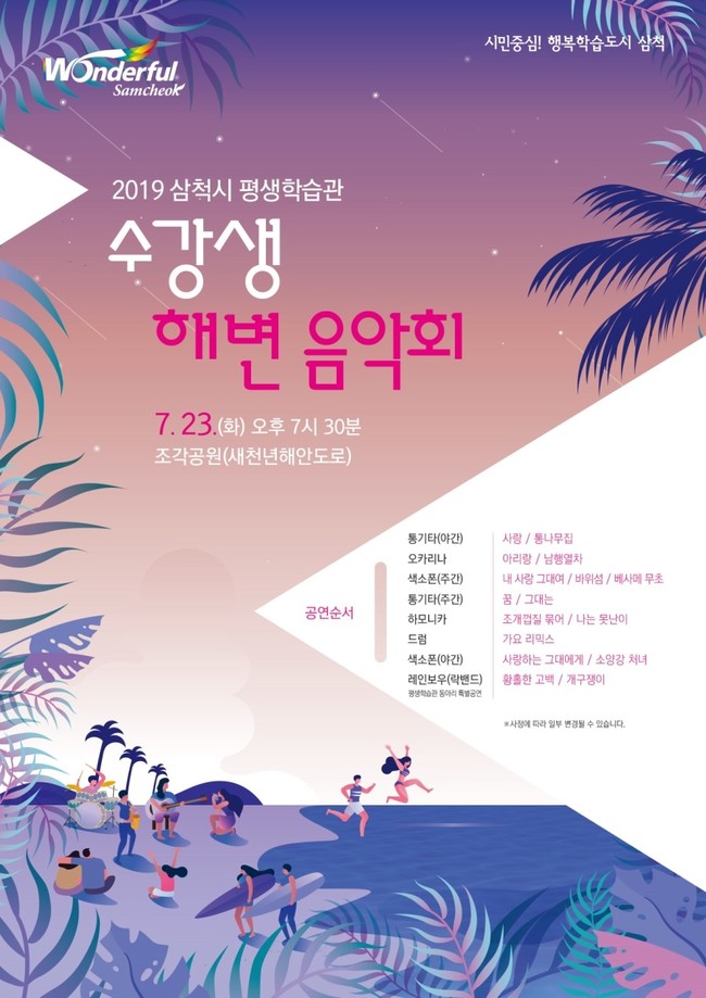 삼척 평생학습인들의 열정으로 한여름 밤의 무더위를 잊게 할 ‘2019 평생학습관 수강생 해변음악회’가 오는 23일 저녁 7시 30분 새천년해안도로 조각공원 야외공연장에서 펼쳐진다.