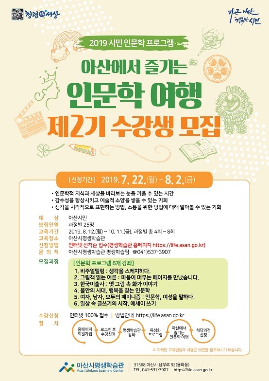 지난봄 제1기 과정에 이어 운영되는 2019 시민 인문학 프로그램 ‘아산에서 즐기는 인문학 여행’ 제2기 과정은 한여름 무더위를 식혀주는 수준 높고 재미있는 강의가 될 것으로 기대를 모으고 있다.
