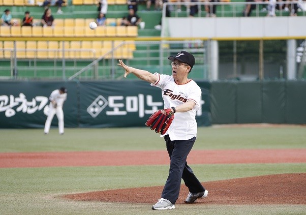 경기장에서는 괴산군 느티울합창단의 애국가 제창에 이어 이차영 군수가 신동운 괴산군의회 의장과 함께 각각 시구, 시타자로 나서 경기 시작을 알렸다.