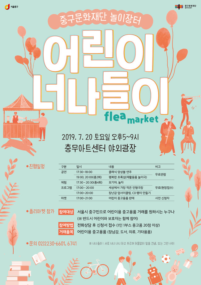 중구는 오는 20일 오후 5시부터 충무아트센터 야외광장에서 중구문화재단이 주최하는 놀이장터 '어린이 너나들이'가 열린다고 밝혔다.