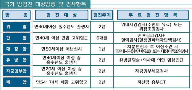 대상자는 의료급여수급권자, 건강보험가입자와 피부양자 중 월 보험료 기준 하위 50%이며 검진 암종은 위암, 간암, 대장암, 유방암, 자궁경부암, 폐암이다.