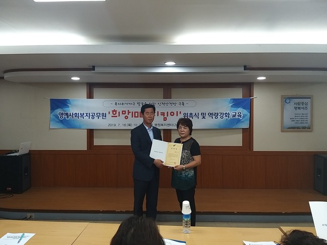 위촉식 이후에는 명예사회복지공무원의 역할과 활동방법에 대해 안내하였으며 자살위기가구 발굴을 위해 여주시정신건강복지센터 윤상흠 팀장이‘생명사랑지킴이’를 주제로 역량교육을 실시했다.