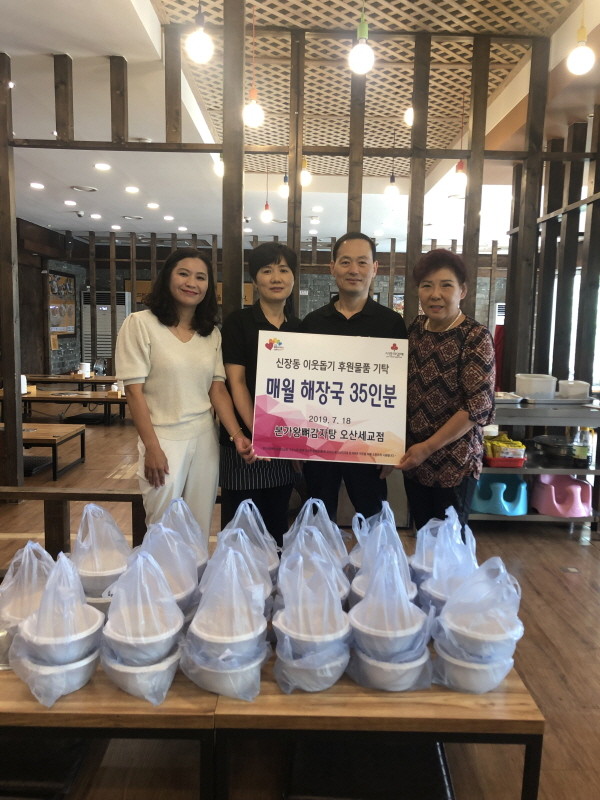 본가왕뼈감자탕오산세교점은 바쁜 일정에도 불구하고 평소 품고 있던 어른 공경과 이웃사랑을 실천하고자 신장동행정복지센터에 이웃사랑의 뜻을 전달했고, 7월부터 매월 1회 우거지 해장국 35인분을 제공하기로 약속했다.