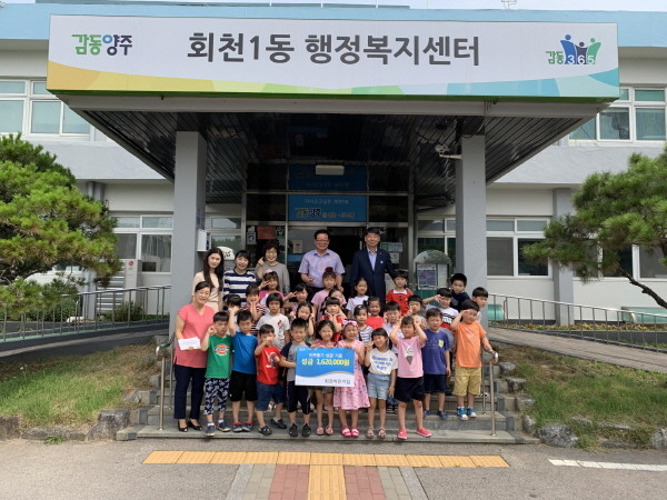 양주시 회천1동 행정복지센터는 지난 18일 덕정동 소재 공립회천어린이집 어린이집 교사들과 7세반 원아들이 동 행정복지센터를 방문, 이웃돕기 성금 162만원을 기탁했다고 밝혔다.