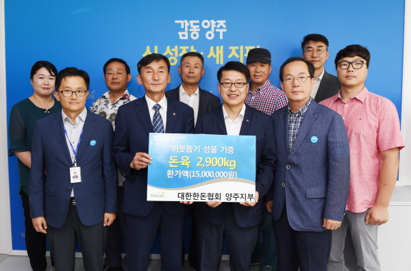 조영욱 지부장은 “우리 주변의 소외된 이웃들이 일찍 시작된 여름철 돈육을 든든하게 드시고 무더위를 잘 견딜 수 있도록 양주시 축산농가들이 뜻을 모아 기부하게 되었으며 앞으로도 지속적인 나눔으로 훈훈한 사회가 될 수 있도록 이웃돕기에 동참하겠다”고 전했다.