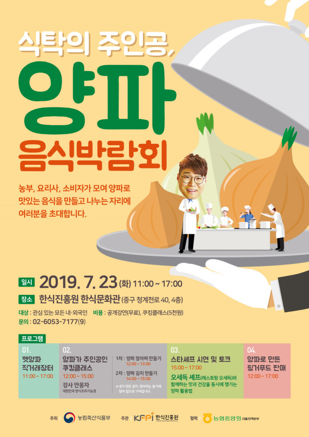 이번 박람회는 양파가 식탁에서 훌륭한 만능 식재료임을 홍보하기 위해 농부, 요리사, 소비자가 함께 맛있는 음식을 만들고, 건강하게 양파를 소비할 수 있는 다채로운 행사가 진행 될 예정이다. 진흥원은 이날 국내·외 참가자만 500여명에 이를 것으로 내다보고 있다.