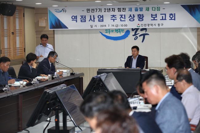인천 동구는 19일, 구청 대상황실에서‘민선7기 2년차 역점사업 추진상황 보고회’를 가졌다