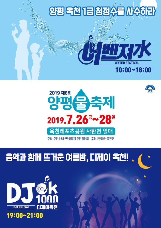 ‘제8회 양평 물 축제’가 오는 26일부터 28일까지 옥천 레포츠공원 및 사탄천 일원에서 양평군, 옥천면 양평물축제 추진위원회 주관으로 낮에는 옥천수를 사수하기 위한 어벤져水 물총싸움과 어린이 마술쇼 및 버블쇼 등 각종 공연과 밤에는 음악과 함께 뜨거운 여름밤을 날려버릴 DJ OK 1000 페스티벌이 진행된다.