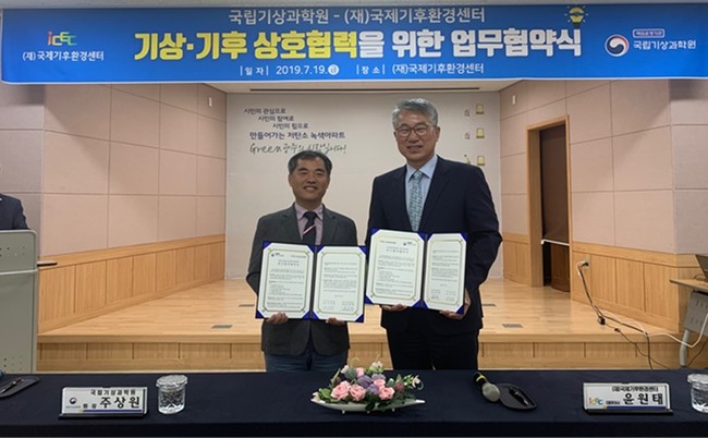 기상청 국립기상과학원은 7월 19일 오전 10시, 국제기후환경센터와 기상·기후연구 협력 및 지역사회 기후변화 대응책을 마련하기 위한 업무협약을 체결했다.