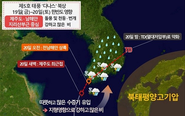 태풍 ‘다나스’는 점차 우리나라로 북상해 19일 오후 제주도남서쪽해상으로 진입해, 20일 새벽 제주도서쪽해상을 지나, 오전에 전남해안에 상륙하겠습니다. 이후 남부지방을 지나 경북내륙을 거쳐 동해상으로 빠져나가 20일 밤 동해상에서 열대저압부로 약화되겠다.