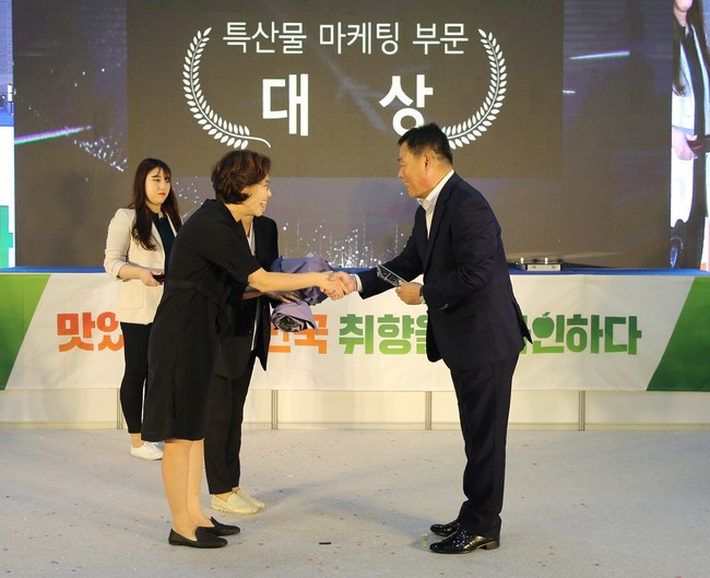 특산물 마케팅부분 대상 시상은 이날 11시에 박람회에 참석한 김산 무안군수가 직접 수상하는 영예를 안았다.