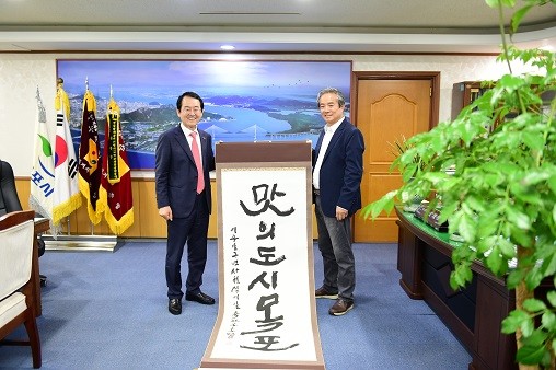 목포에서 활동하는 죽전 송홍범 서예가가 지난 18일 ‘맛의 도시 목포’라고 쓰인 족자 1점을 목포시에 기증했다.