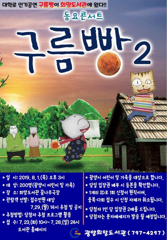 광양희망도서관은 지역 어린이들을 위해 그동안 지역적, 예산적인 한계로 제공하지 못했던 수도권의 수준 높은 공연들을 섭외해 연말까지 월 1회씩 총 6회 운영할 예정이다.