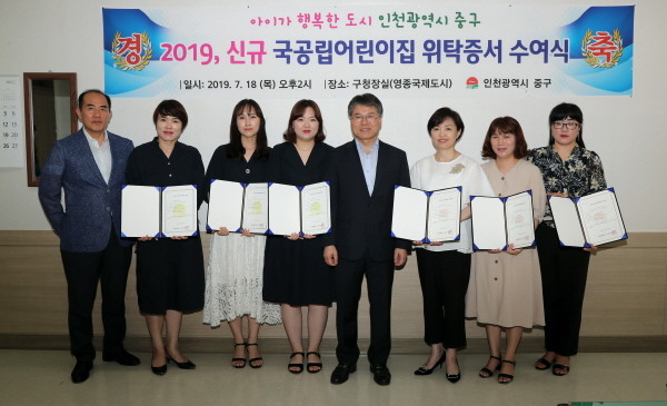 인천 중구는 지난 18일 영종국제도시 2층 구청장실에서 2019년도 신규국공립어린이집 6개소 위탁계약증서를 수여하고 위탁계약을 체결했다.