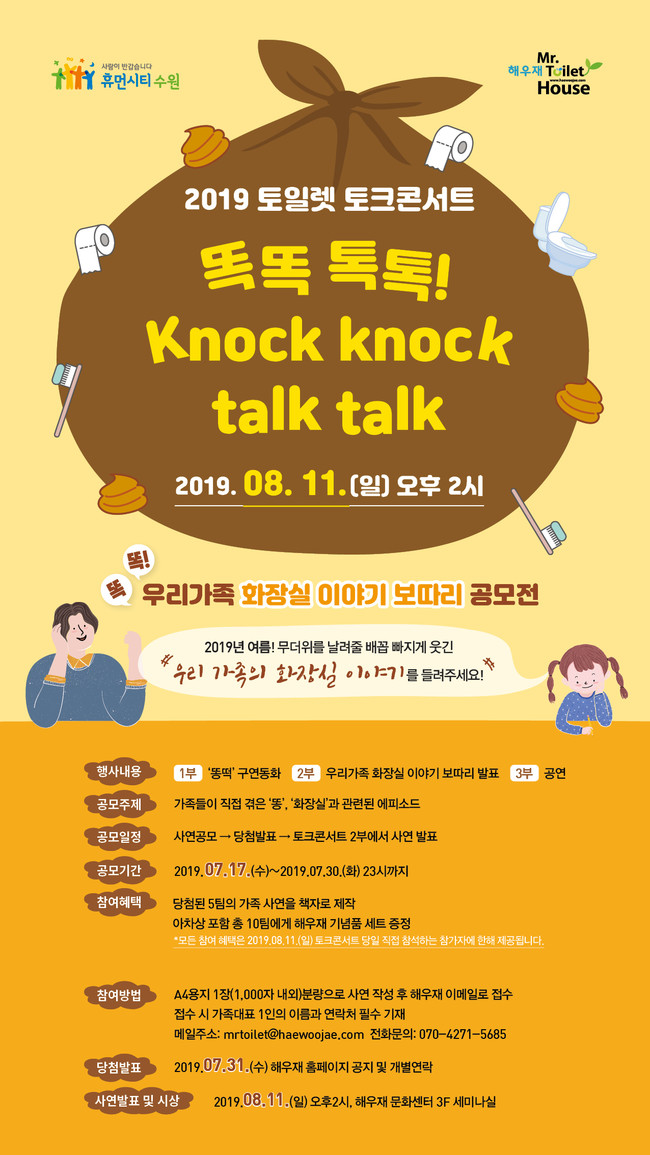 수원시 화장실문화전시관 ‘해우재’는 ‘2019 토일렛 토크콘서트, 톡톡 똑똑’에서 이야기 나눌 ‘우리 가족 화장실 이야기’를 공모한다.