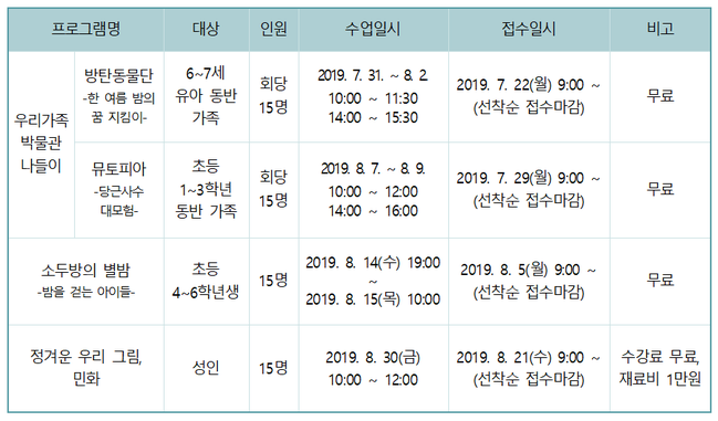 유아프로그램 ‘방탄동물단–한 여름 밤의 꿈 지킴이’는 31일부터 8월 2일까지 오전 10시와 오후 2시에 진행된다. 참가자들은 삼국시대 동물과 고대 토템신앙에 대해 알아보고, 특별기획전 ‘삼국시대 동물 이야기’를 관람한 뒤 직접 선택한 동물 모양으로 드림캐처를 만드는 공예체험을 할 수 있다.