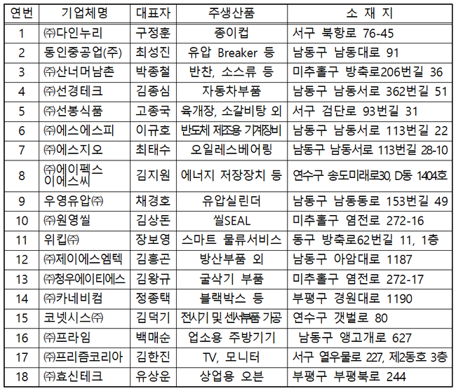 인천시는 인천소재 제조업, 지식기반서비스업, 마이스산업 관련 중소기업을 대상으로 2017년 대비 2018년 근로자 증가 인원이 5명 이상이고, 근로자 증가율 5% 이상인 기업을 지난 3월부터 5월까지 공모해 일자리 성장성과 안정성 등에 대한 서류심사와 현장 실사를 거쳐 18개 기업을 일자리창출 우수기업으로 선정했다.