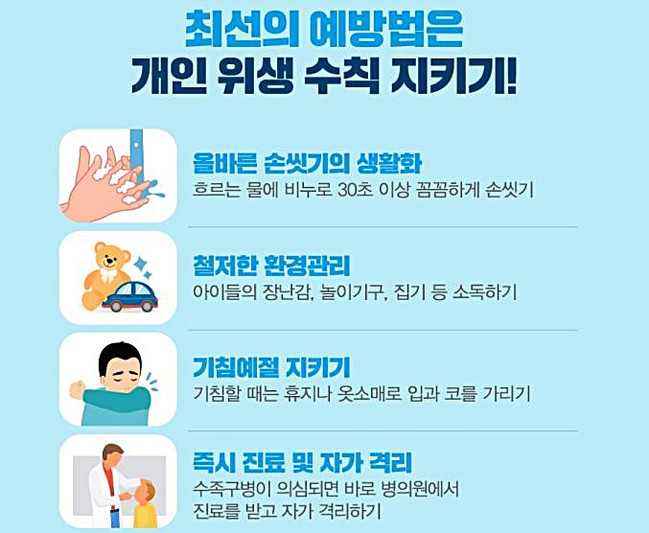 급성 바이러스 질환인 수족구병은 증상 발생 후 7일부터 10일이 지나면 대부분 자연적으로 회복되는 질병이며, 올바른 손 씻기 등 개인위생을 철저히 준수하면 예방이 가능하다.
