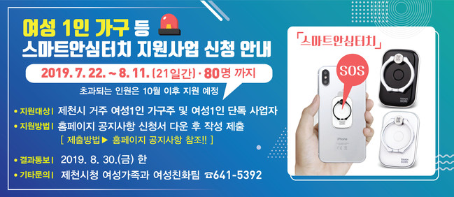 제천시는 여성 1인 가구의 안전한 주거생활 및 여성1인 점포의 안전한 영업활동을 지원하기 위해 다음과 같이 스마트안심터치 지원사업을 실시한다고 밝혔다.